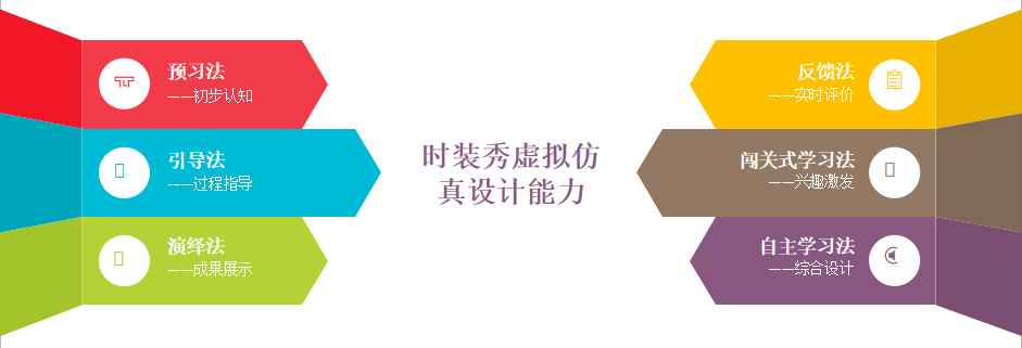 本实验教学项目依托温州大学的时尚服装虚拟仿真实践中心和《服装三维设计》的在线时装秀虚拟实验网站,利用现代信息技术等手段,大力推进实验教学改革,结合学校的实际教学情况,实行预习法、引导法、演绎法、反馈法、闯关进阶式学习法和自主学习法六大实验教学法,遵循以学生为主体,以教师为引导的理念,培养学生创新意识和主动学习的能力。具体实验教学遵循以下六大教学方法(见图9):