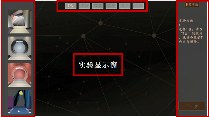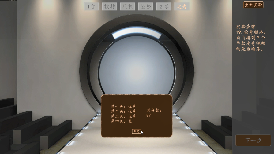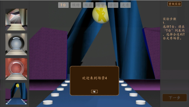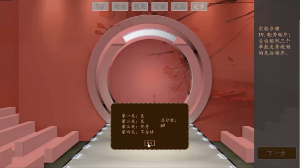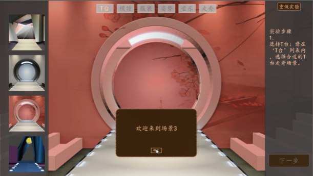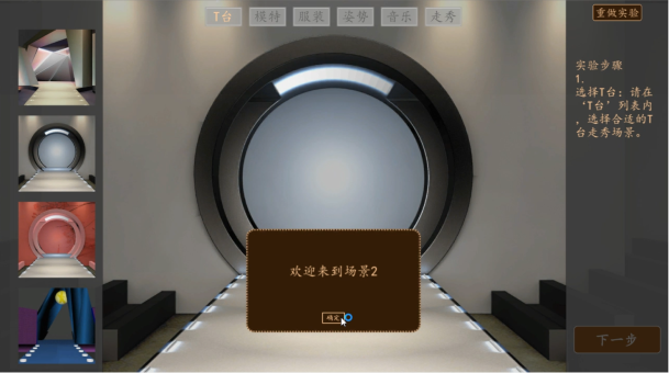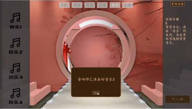 2.引导法。进入“四层六关十步骤”的实验后,每一关卡的每一个步骤都有文字引导,学生根据引导内容进行符合要求的操作,对T台、服装、人模、走姿、音乐等各个环节进行选择。