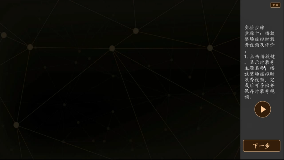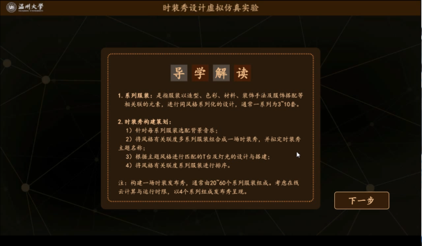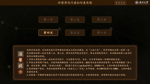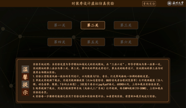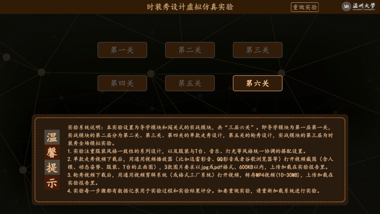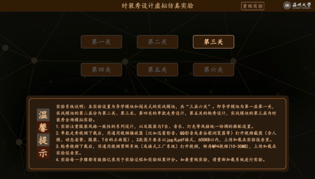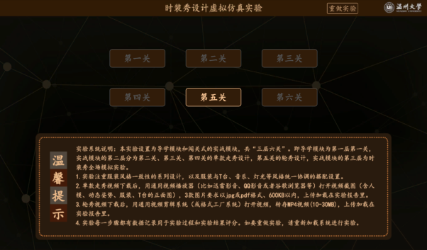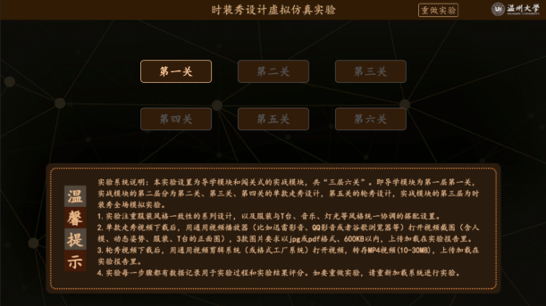 进入系统后首先显示的是“主界面”,点击【开始实验】进入下一个模块。并根据“温馨提示”要求,完成相应操作。本实验设置了“四层六关十步骤”的闯关式综合设计型实验,第一层为第一关的现实时装秀构建导学,、第二层含第二关至第四关的单款走秀,第三层为第五关的系列款轮秀;第四层为第六关的全程时装秀设计,具有顺序递进、过程推演的相互关联性。其次,系统自动客观评价实验过程和实验结果,并将综合成绩上传平台;同时可保存单款走秀、系列款轮秀、多系列全程时装秀的视频。