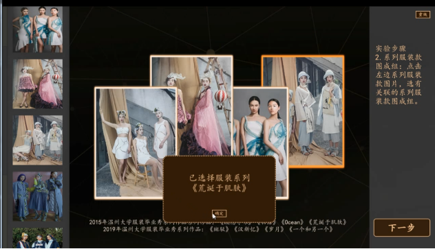 ③ 系列服装款图成组。在众多系列服装款图中,选出有关联度的系列服装归为一组,如分组有误则出现提示,可重新选择有关联的系列服装,选择成功后点击右下角的“下一步”(如图14)。