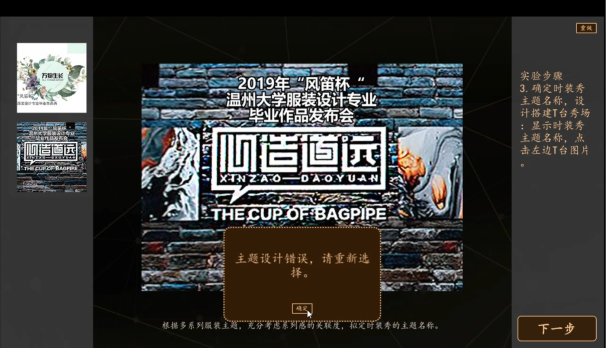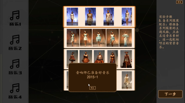 步骤九:系列秀音乐配设。根据每系列服装的特性,选择匹配对应的合适音乐。如音乐与系列服装冲突,则出现不匹配提示,并可重选确定。依次配音乐正确后,点击下一步(见图45)。