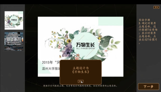 6.自主学习法。当学生到达最后一关时,需要学生发挥主观能动性,综合前置关卡所学的内容,自主策划一场虚拟时装秀。