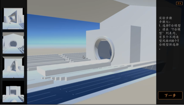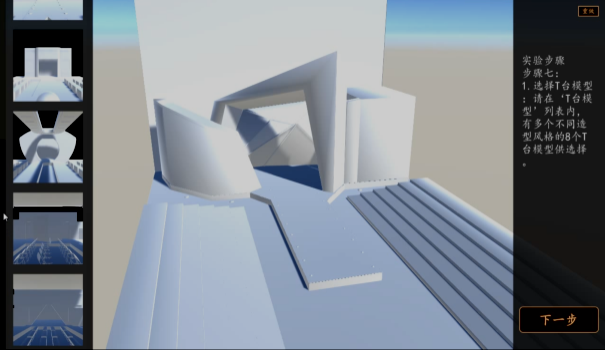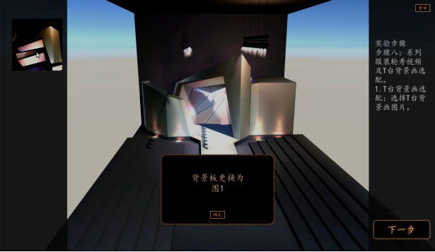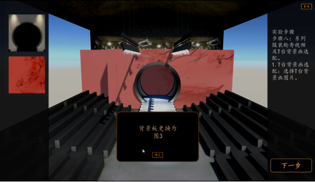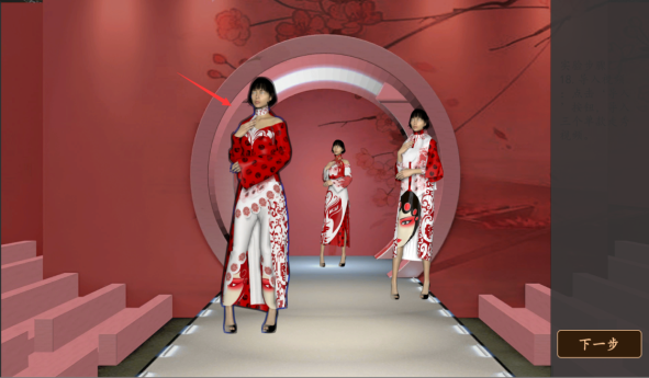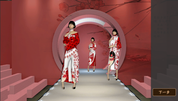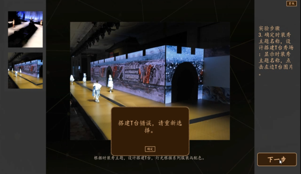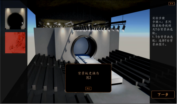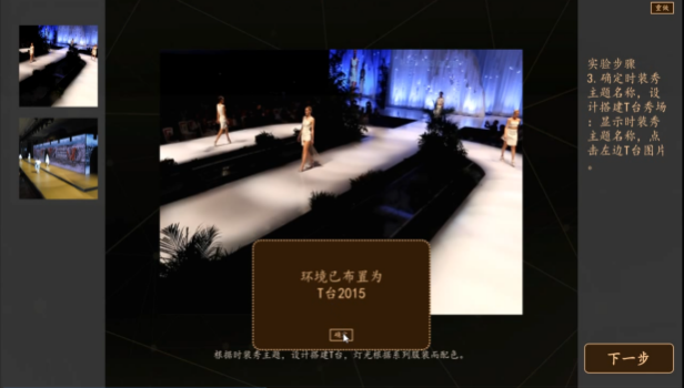 步骤操作:请在‘T台’列表内,有多个不同造型风格的T台供选择。可先点击上方“服装”菜单,浏览左边素材区的不同风格多系列的服装款,确定本次实验意向服装,点击上方“T台”菜单,左边素材区选择合适的T台模型,分别有现代式场景、中式圆拱门、星球科幻等T台造型风格。选择后点击右下角的“下一步”。