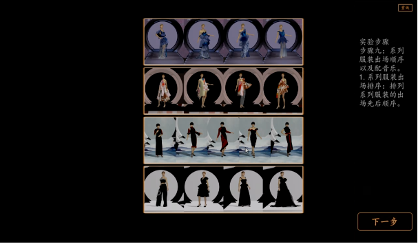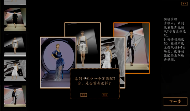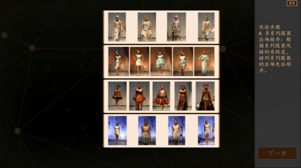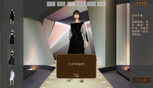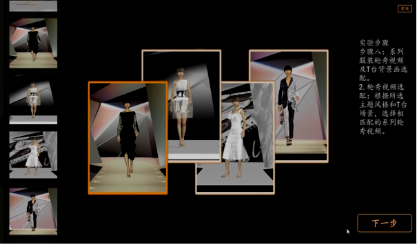 步骤操作:请在‘服装’列表内,为模特选择第一款走秀服装。有意向性地男模配男装,女模配女装。因男模与女模的体型特征存在差异,服装的造型风格、阳刚阴柔表现、色彩取向等均有不同,实验中如果错选男女装,服装与模特之间会穿透;其次选择的服装与T台的造型风格、色彩灯光追求匹配协调感,这是走秀主题风格协调设计的关键,是设计实验过程评价的重要依据。搭配正确,如未能选择最为匹配的选项,则过程评价会扣分,可重选。选择后点击“下一步”(见图24)。