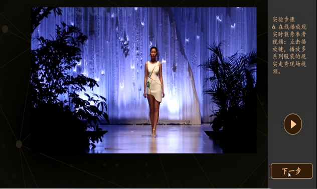 ⑦ 现实时装秀参考视频在线播放。点击播放键,播放多系列服装的现实走秀现场视频,以供学生自我校正和在线学习虚拟时装秀设计实验(图19)。