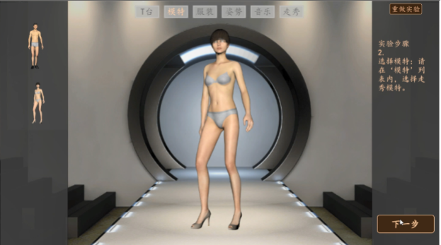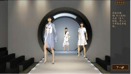 选择人模、第二款服装等,进行单款走秀虚拟仿真实验操作。 |