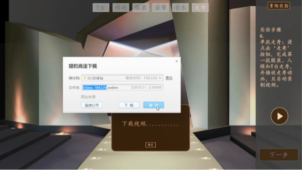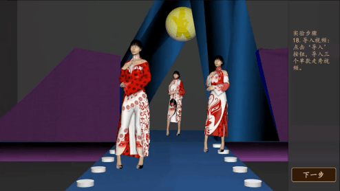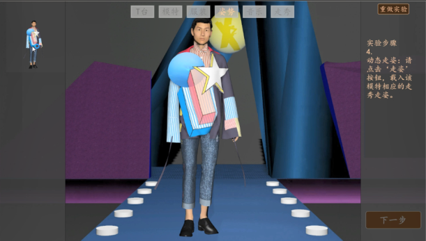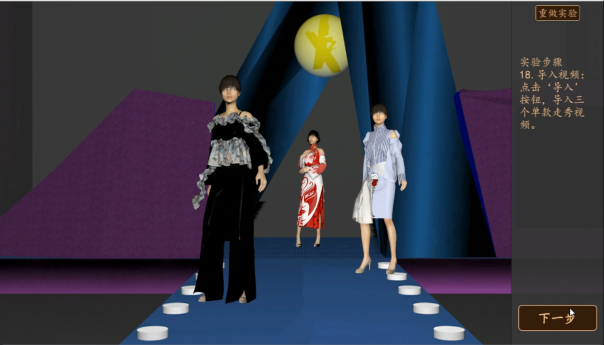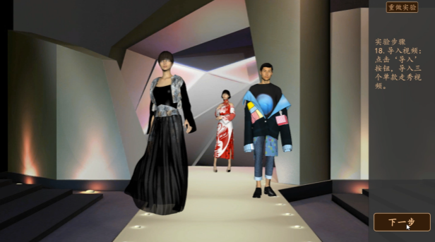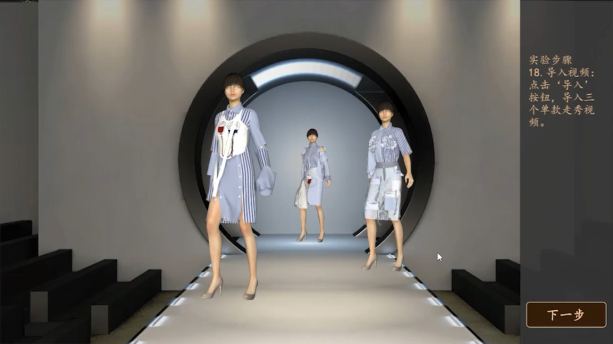 选择人模、第一款服装与场景等,进行单款走秀虚拟仿真实验操作。 |