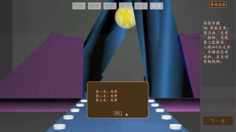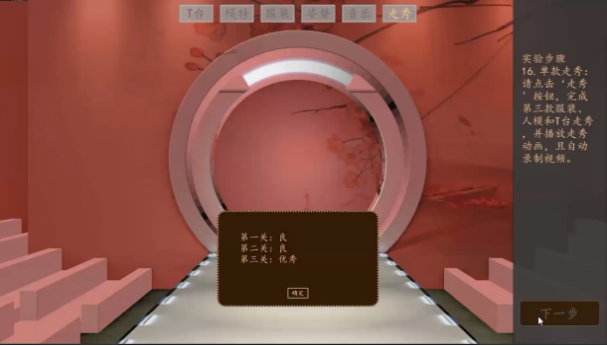 选择人模、第三款服装等,进行单款走秀虚拟仿真实验操作,自动评价前三款走秀设计。 |
