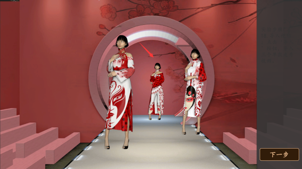 步骤操作:请点击‘姿势’按钮,载入该款服装模特的走秀姿势,模特就会在候场区就位。因男女有别,其走秀姿态也有差异,本项目设计了女模有不同走姿可选,各服装款有对应的走姿。选择后点击“下一步”(见图25)。